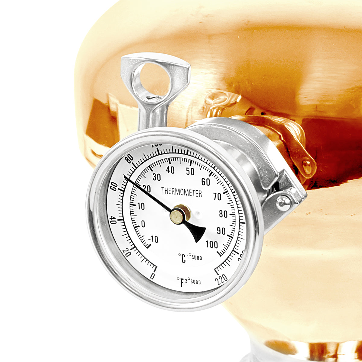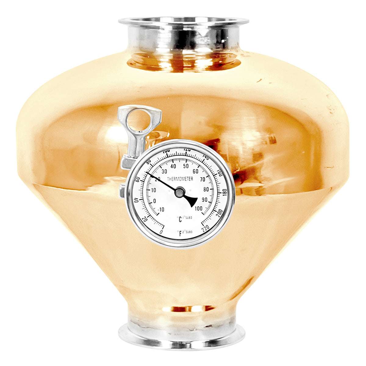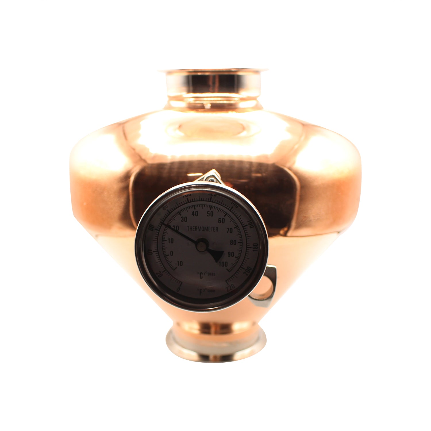 This helmet is designed to seamlessly fit into various distillation systems, making it a versatile upgrade for your reflux column or moonshine still. It comes with 4" tri-clover fittings and a 1.5" tri-clover port, which is designed to be paired with the included 1.5" tri-clover thermometer. Making this Whiskey Helmet a crucial component for any distillation setup.