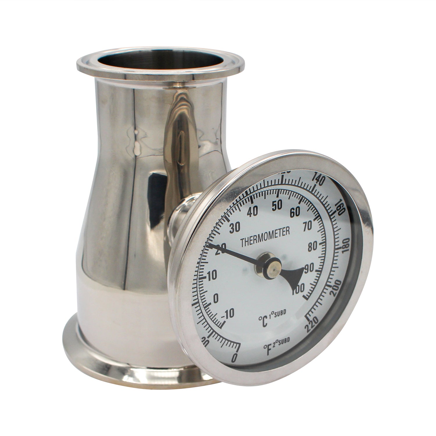 This Tri-Clover Concentric Reducer is made out of sanitary 304 stainless steel and comes equipped with an integrated thermometer which threads onto the 1/2" female NPT connection that is welded onto the side of the reducer. It seamlessly attaches to a 3" tri-clover connection allowing utilization of 2" tri-clover hardware and equipment.
