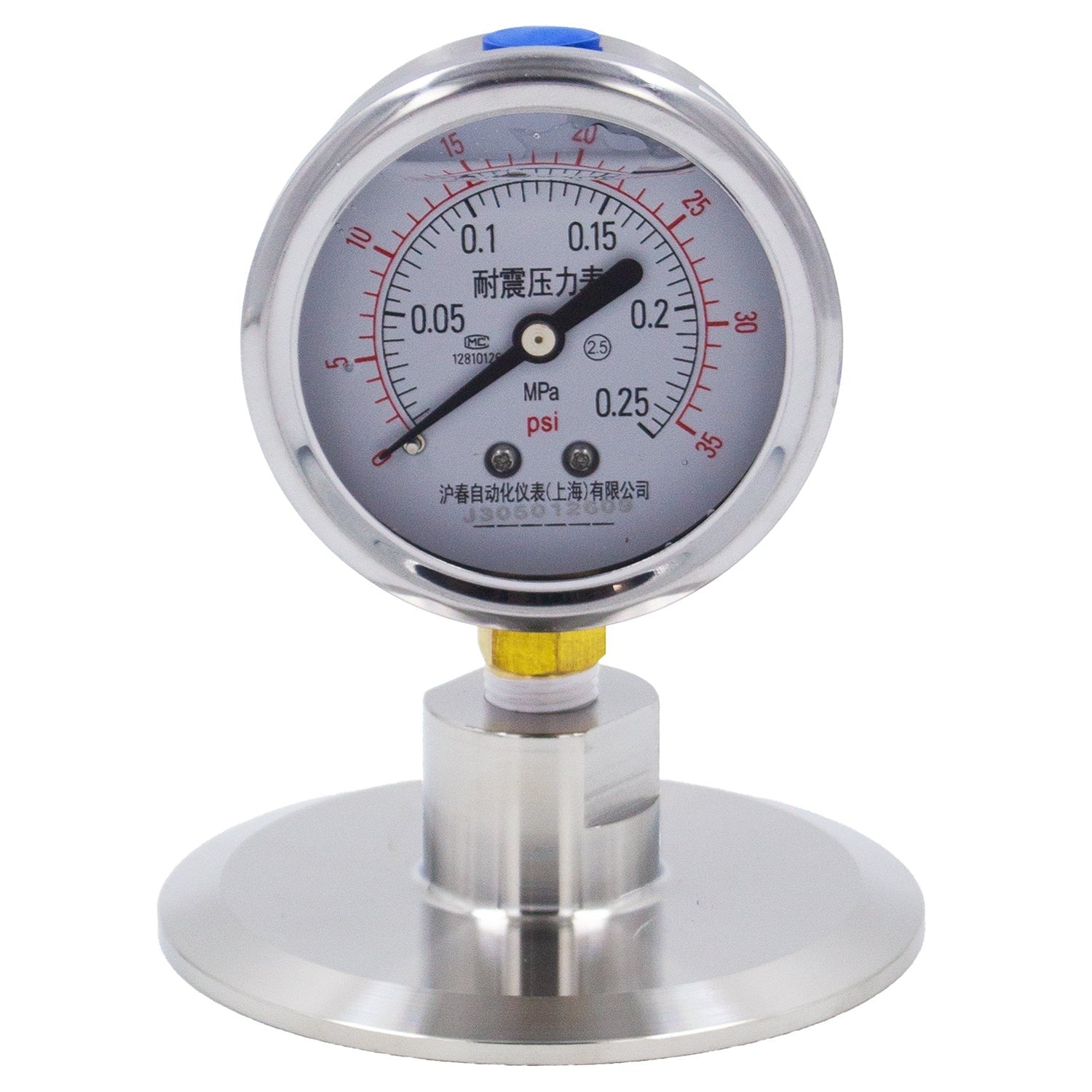 This pressure gauge, filled with fluid, covers a PSI range from 0 to 35. Crafted from robust 304 stainless steel, it seamlessly attaches to 3" Tri-Clover hardware. When integrated into your TC setup, this gauge simplifies gas pressure monitoring.