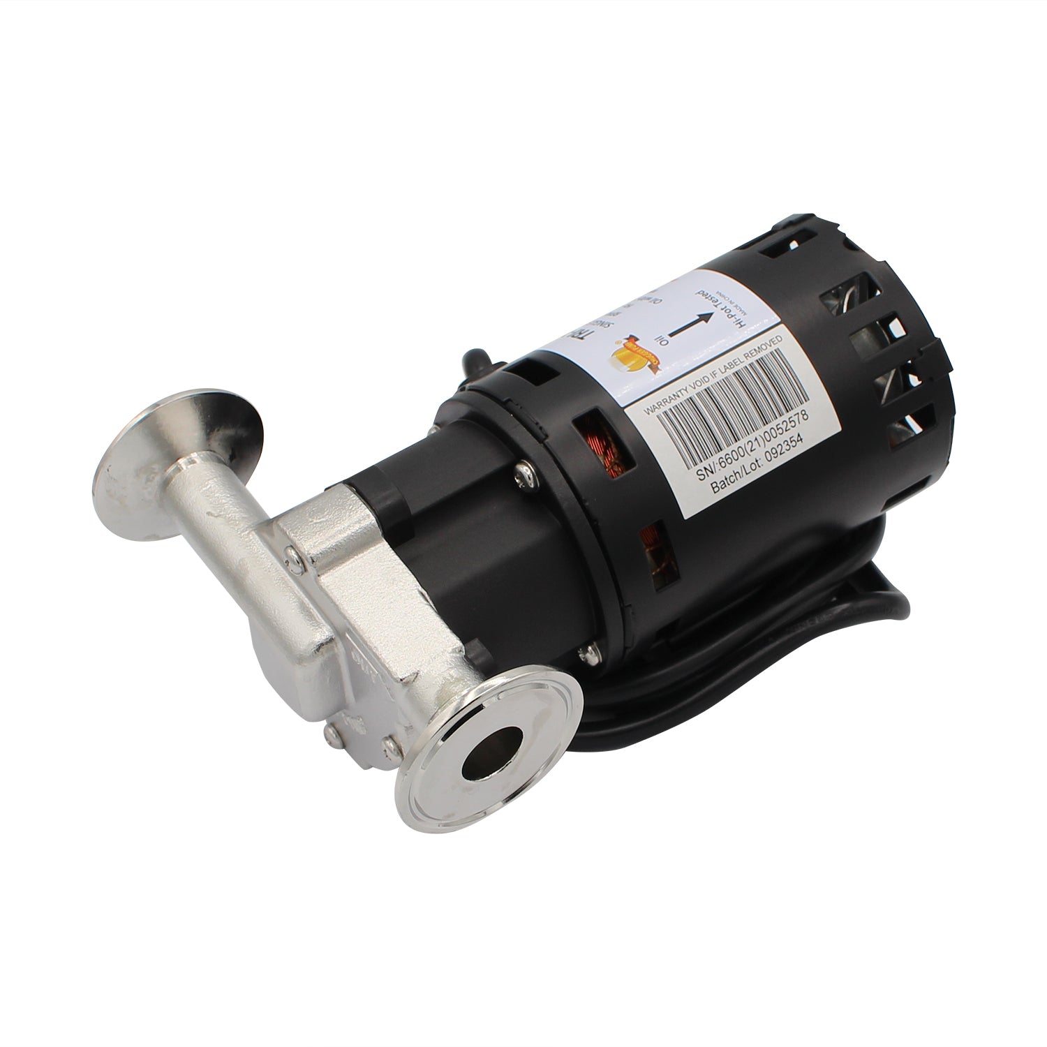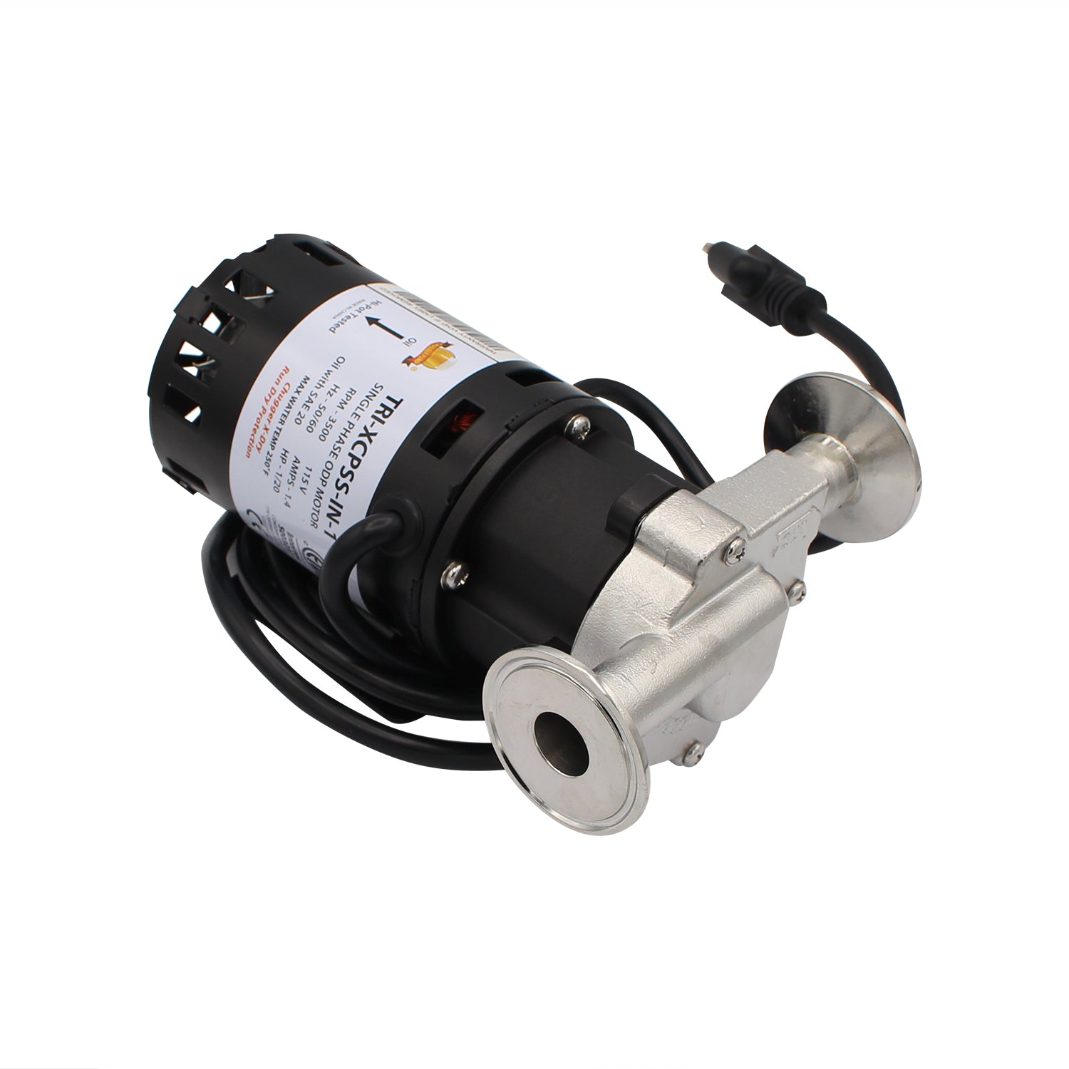 This is the inline version where the inlet and outlet are 180° opposed to each other. This pump can handle liquids up to 250°F, the inlet and outlet are 1.5" Tri-Clover connections allowing for the easy attachment of TC hardware. Tri-Clover fittings are the perfect way to ensure sanitary connections, they are found in commercial brewing setups. Please note that you should never restrict the inlet of the pump, only the outlet.