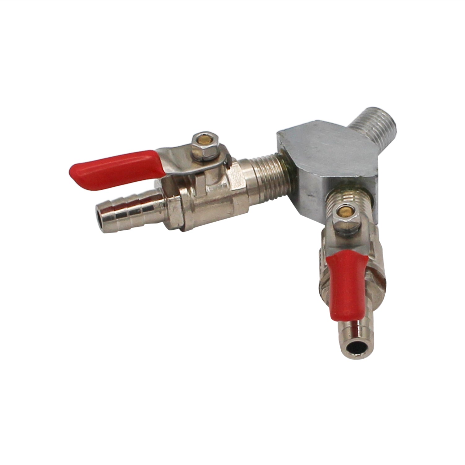 1/4" Male NPT right hand thread to attach to your regulator. Two outputs with 3/8" barbs, all our valves have built in checks for safety and performance.